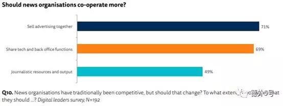 新闻机构传统上在各个层面竞争激烈,但这种情况在2019年会发生变化吗? 更多的合作可以让媒体抱团,有对抗平台的实力,并支付得起更复杂的技术。 国际新闻合作也明显对诸如巴拿马文件等话题产生了影响,而英国伦敦新闻调查局展示了将数据收集和分析与强有力的本地报道相结合的价值;巴西的Comprova和墨西哥的Verificado选举期间用新方式合作。调查显示媒体专家强烈支持媒体合作,超过三分之二的人认为媒体应当在广告(71%)或技术(69%)上合作,49%的人赞成共享新闻资源或内容。