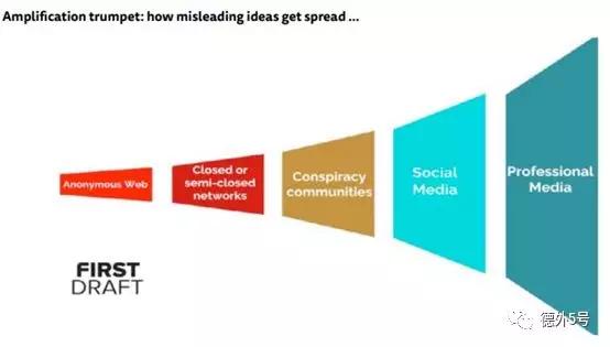 要核对事实并揭露谎言,需要更好地理解故事如何传播以及故事由谁传播。 First Draft研究表明,误导性内容通常首先出现在匿名网络(如4chan 、Discord),然后进入封闭或半封闭网络(如WhatsApp或Facebook群组),之后在Facebook、Twitter和Instagram等公共网络辅助下,进入网络社区被广泛讨论(Reddit论坛、YouTube频道),广播媒体和报纸报道和夸大这些申诉常常使问题变得更糟。 去年9月,社交媒体学者达娜·博伊德警告说,媒体正在被“玩弄”,应当更谨慎地确认报道问题的真实性。