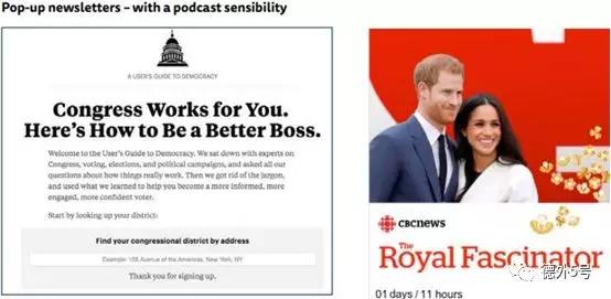 媒体商业模式转向关注培养读者忠诚度和用户留存率,这就是为什么越来越多媒体又重新开始提供新闻简报(Newsletter)。2018年出现了推送式新闻简报,鼓励读者时不时地阅读。比如,CBC为王室婚礼做过一个名为Royal Fascinator的八周系列报道。而Politico试验用八周的新闻简报教育年轻投票者,吸引了8000多位读者,简报打开率超过55%。