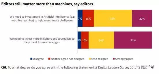 超过四分之三(78%)受访者认为有必要向人工智能(AI)投入更多,以便拯救新闻业的未来,但是并不能因此就不再雇佣新的编辑。73%的人认为增加个性化是走向未来的关键。