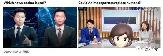 媒体已经实现使用自动化技术实现数据类新闻自动报道,下一步似乎是发展虚拟新闻主播。 中国国家新闻机构新华社已研发出一款机器人新闻主播,能随时工作,它模仿新华社真人主播的声音、嘴唇动作和表情,早期可能显得缺乏过于严肃,但专家认为最终甚至可以让它有幽默感。与此类似,日本放送协会推出了动画AI主播,可以为有听力障碍的人手语播报新闻,还可以与真人主播联合主持。