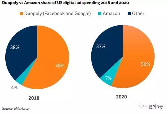 双寡头变三寡头:亚马逊在数字广告市场中力量不断增强,有望与谷歌和Facebook分一杯羹,预计到2020年,亚马逊将占美国数字广告支出的7%。