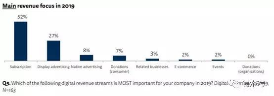 52%的专家认为订阅和会员制是2019年媒体的主要收入来源,27%专家认为是广告收入,8%认为是原生广告,7%认为是捐赠。