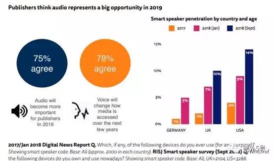 由于播客的日益普及以及数以亿计的智能音箱售出,音频将成为2019年媒体最热门的话题之一。 据估计,美国多达4000万人拥有智能音箱,英国约为700万人有智能音箱。调查显示,四分之三的受访者(75%)表示音频在内容和商业战略中愈加重要。 许多媒体现在正在成立音频制作单位。 多数人(78%)认为语音激活技术(亚马逊Alexa助手、谷歌助手)将改变观众在未来几年发现媒体的方式。