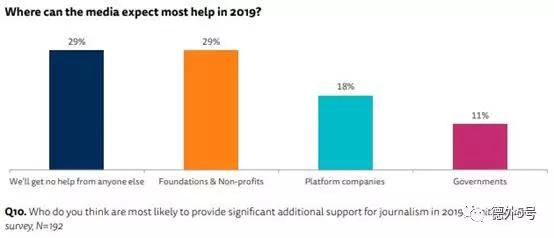 越来越多人认为优质新闻需要补贴。大约三分之一(29%)预计新一年媒体会从基金会和非盈利机构获得帮助,而五分之一(18%)期待技术平台做更多贡献,十分之一(11%)认为政府会提供更多帮助,29%的媒体人不指望上述任何一样拯救媒体盈利。