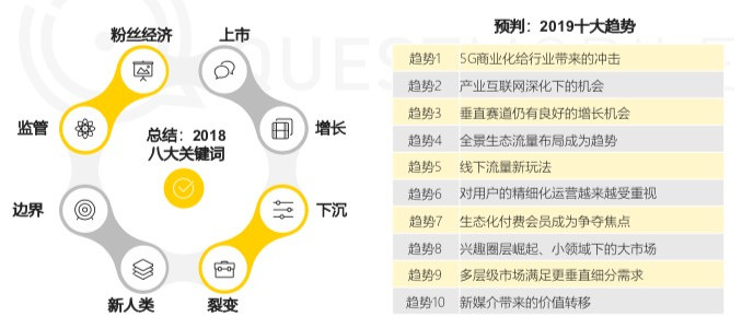 36氪讯,1月22日,中国商业智能服务商QuestMobile发布《中国移动互联网2018年度大报告》。在这份报告中,QuestMobile 将2018年中国移动互联网的八大关键词总结为:上市、增长、下沉、裂变、新人类、边界、监管和粉丝经济。QuestMobile还预判了2019年的十大趋势,5G商业化、产业互联网深化、线下流量新玩法、用户精细化运营等将成为改变2019年移动互联网的新力量。