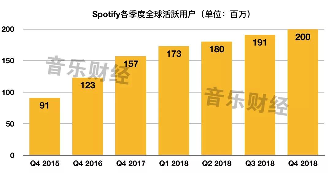 不过,即使就拿2亿作为其2018年的实际成绩,Spotify在月活这一指标上也至少增长了4300万。(官方公布的2017年末的月活数字为1.57亿。)