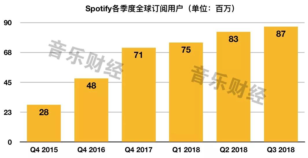 订阅服务方面, 在Spotify 2018年Q3财报的展望中,其预计订阅用户将在 Q4达到9300万至9600万。关于这一目标的完成情况,也将在下月的财报会议揭晓。