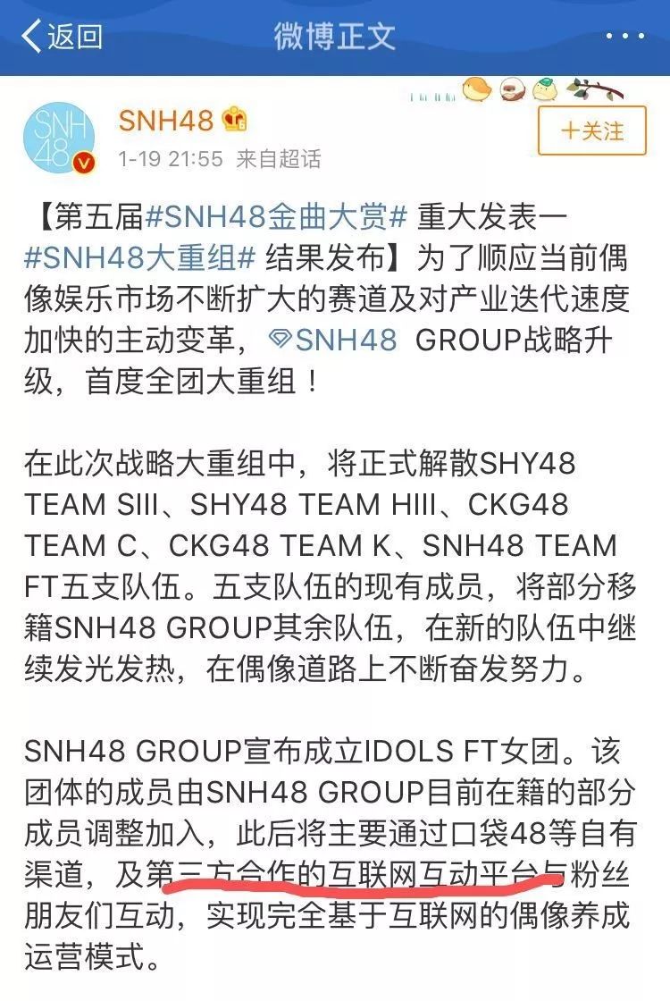 1月19日,少女偶像组合SNH48姐妹团宣布解散。官方声明显示,除了少部分留下的成员组成新团体外,其他成员将于“第三方互联网互动平台与粉丝们进行一系列互动。”而所谓的“第三方互联网平台”,指代的即是直播平台。