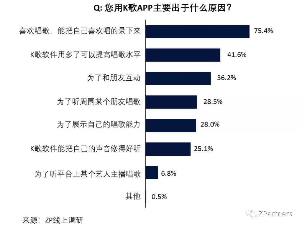 最后提一句全民k歌,ZP调研发现80%以上的用户都把它当做自娱自乐的工具,社交属性并不浓。