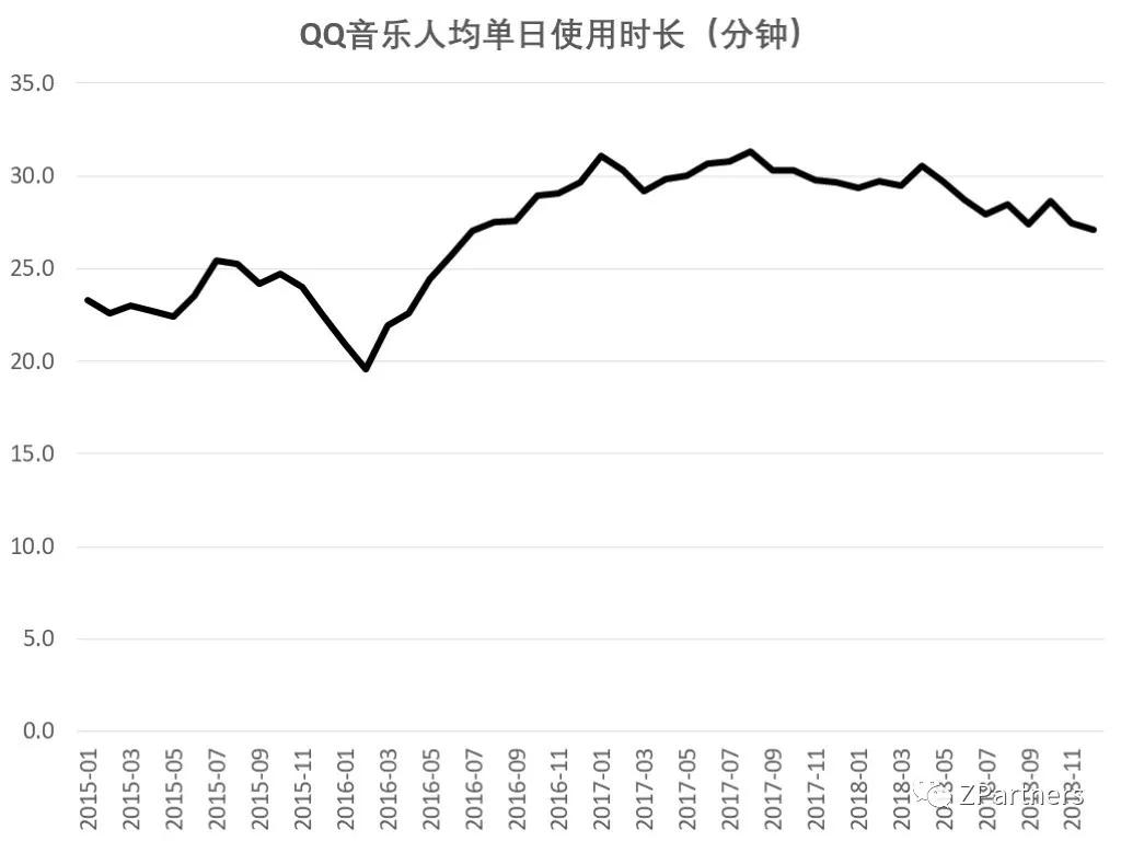 但从所有人群构成的整体来看,群体的生活习惯是相对稳定的不易变化的,听音乐的总时间因此也不会显著增加。从数据上来看,近两年QQ音乐平均每用户的使用时长一直在30分钟上下波动,没有很大变化。