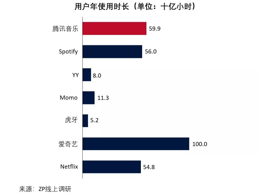 腾讯音乐年用户总时长达到近600亿小时,略高于Spotify和Netflix——TME是个大家伙。