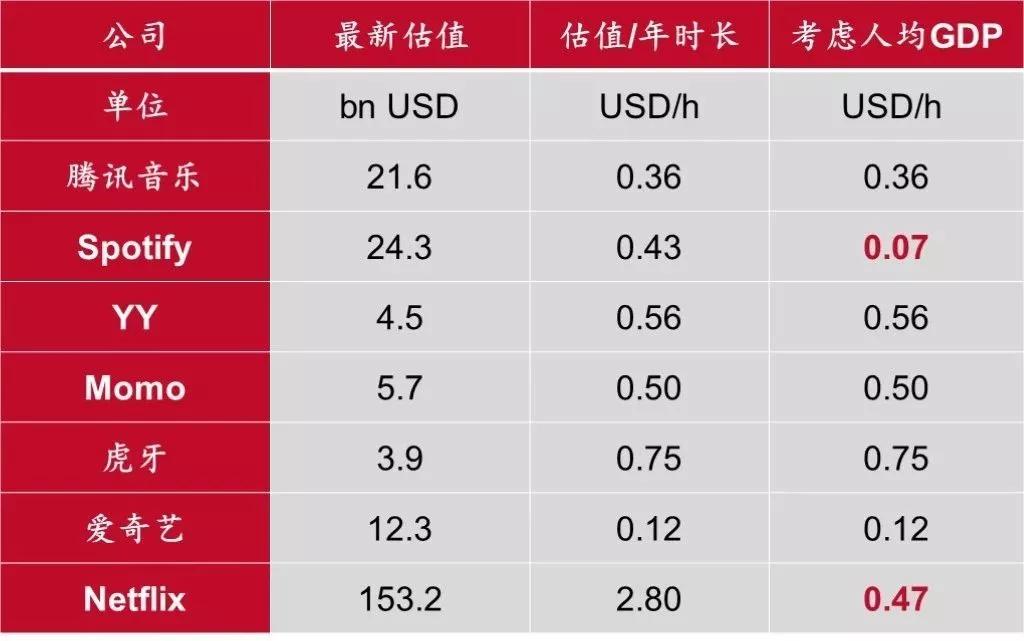 但考虑到美国人均GDP是中国的6倍,那么我们把美国的估值/年时长再除以6折算成中国的情况,发现Spotify的单位价值非常低。这也合理,毕竟音频变现少了广告等手段;如果Spotify是合理的,腾讯音乐就太高了。而Netflix其实符合中国的正常估值水平。