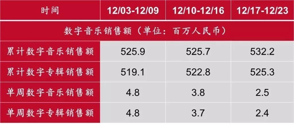 根据ZP合作伙伴百观科技(BigOne Lab)的监测,截止2018年12月23日,QQ音乐数字音乐一共销售额仅为5.3亿元,12月全月销售额仅为1-2千万元,数量甚微。