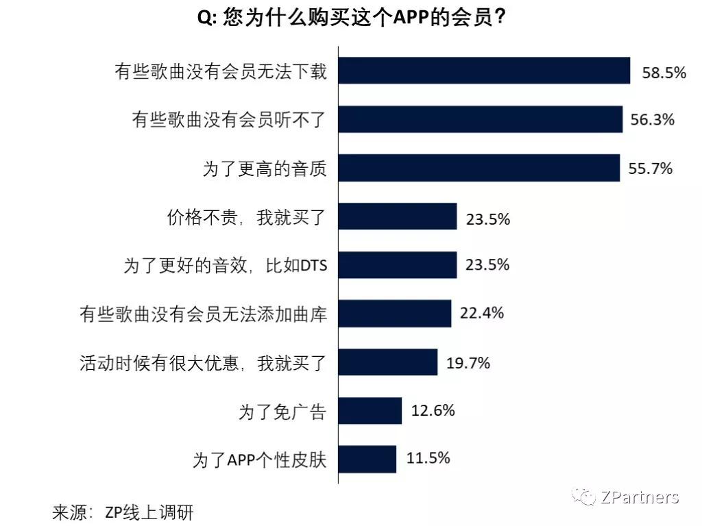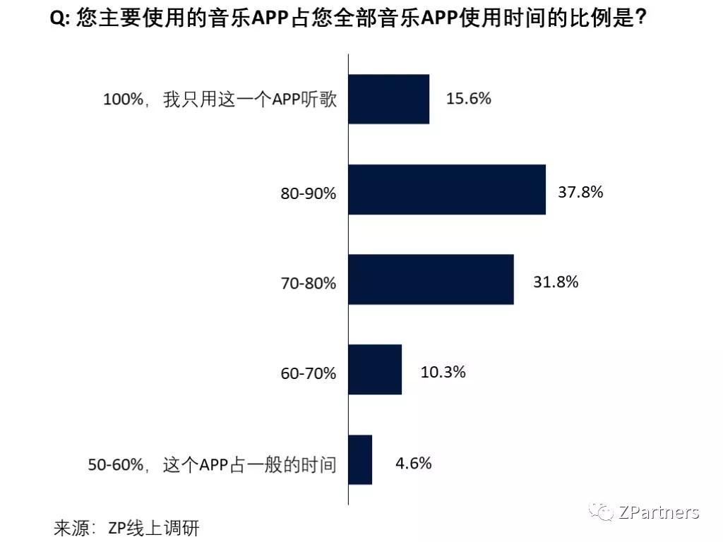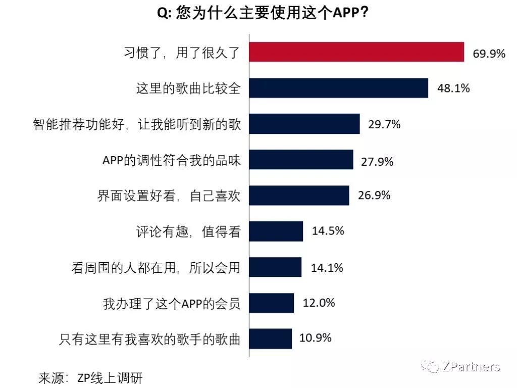 ZP发现,有85%的用户基本上只使用一个音乐app(使用率70%以上),长久的习惯(主要指在一个app中收藏歌单)是最主要的原因。毕竟在国家版权局的掺和下,99%的音乐版权都是共享的,不像猕猴桃有《延禧攻略》,鹅厂有《如懿传》。