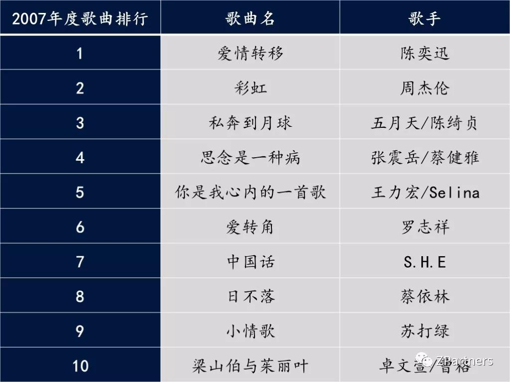 2007年-2013年,榜单中排名前十名的都是响当当的正统音乐艺人。他们创作力强,唱功过硬,作品精致细腻。周董常年霸榜。