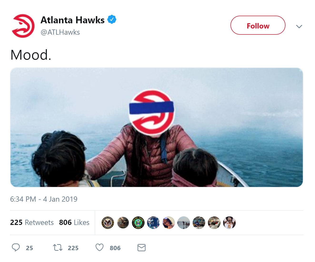 我个人非常喜欢亚特兰大老鹰队在144-112惨败给密尔沃基雄鹿队之后发出的这条Twitter: