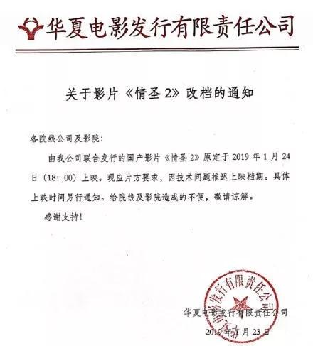 疑似受吴秀波近日风波影响,由吴秀波、白百何和肖央主演的电影《情圣2》,在紧急提档1月24日后,再度紧急撤档。各大院线收到通知:停止该片预售。联合发行方华夏电影,随后发布通知称“应片方要求,因技术问题推迟上映档期。具体上映时间另行通知”。此前该片两次定档合计约400万的预售票房成绩,不敌《小猪佩奇》和《熊出没》,并不为大家看好。