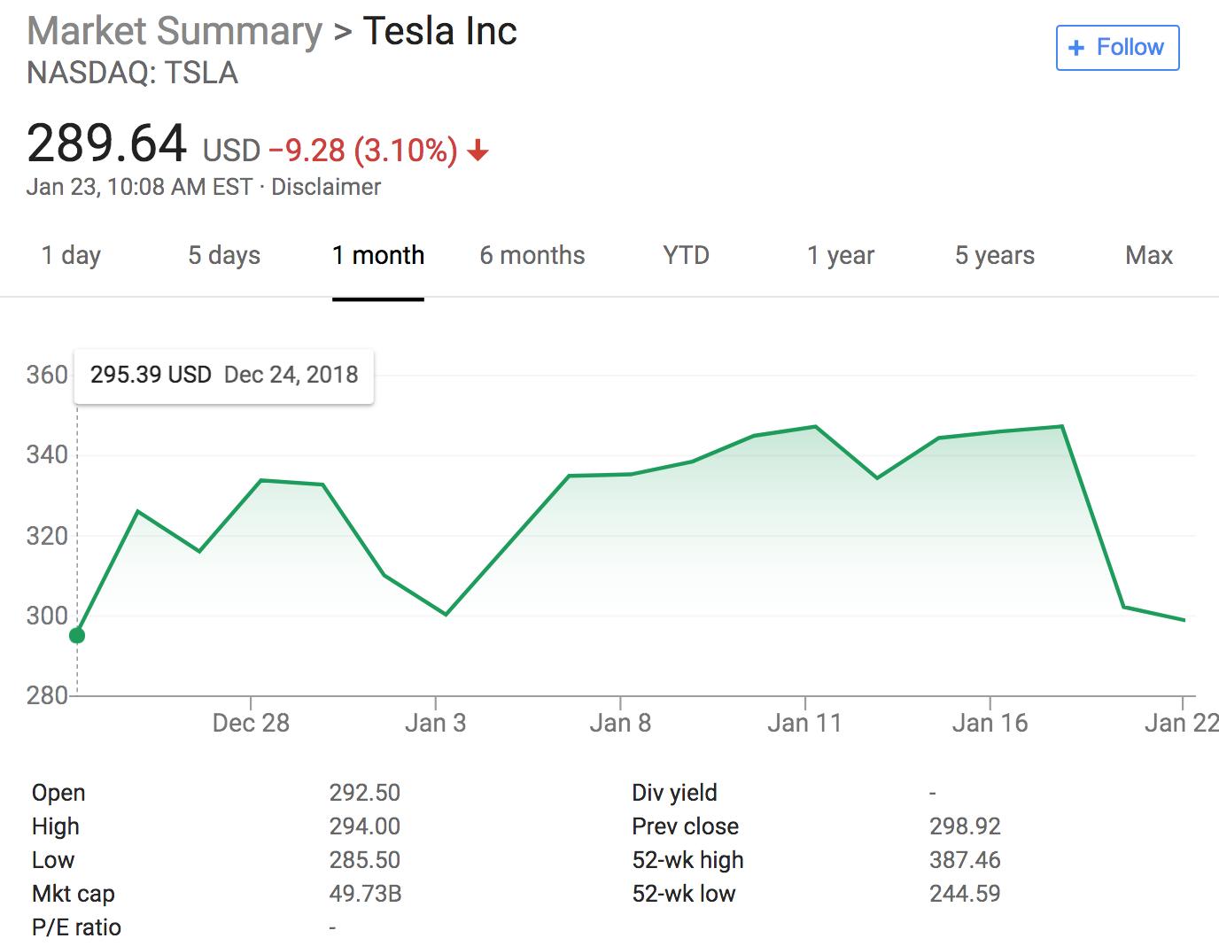 周三截止目前,特斯拉股价下跌3.10%,报289.64美元。