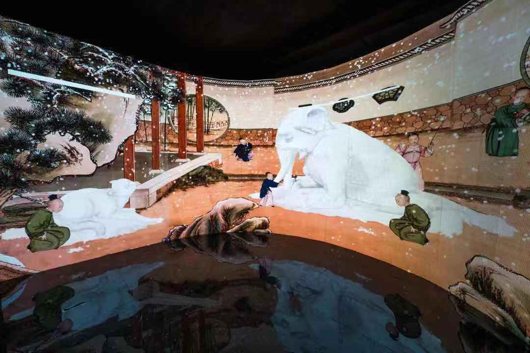 花开岁朝,取自《岁朝图》,站在长10米的 LED 屏幕前,在感应范围内挥动手臂,能够影响花开花落。但实地体验发现,人机互动的流畅度略有延迟。