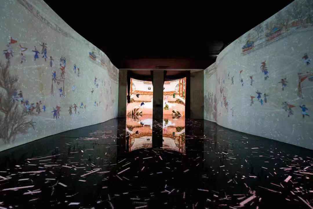 冰嬉乐园将《冰嬉图》做成动态图像投影在两侧墙幕,呈现出八旗子弟技艺高超的“花样滑冰”。走过 LED 屏铺设的“雪地”,观者可以体验到虚实相映中的“踏雪无痕”。