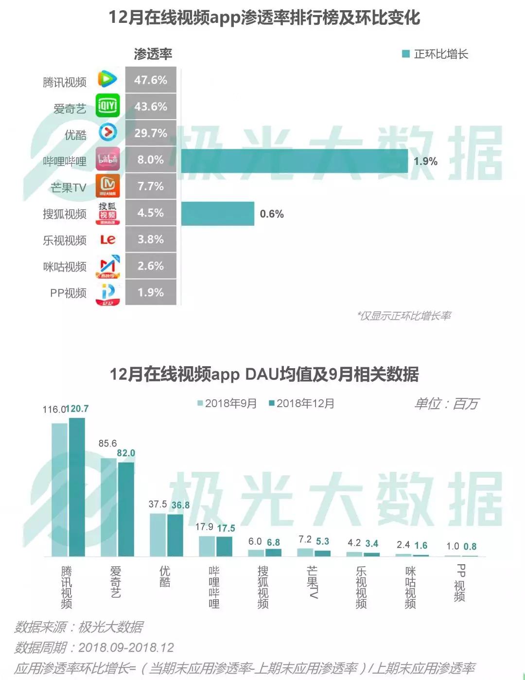 腾讯视频、爱奇艺及优酷的12月渗透率分别为47.6%、43.6%和29.7%,位列在线视频领域前三,渗透率相较9月均有不同程度下滑;哔哩哔哩12月渗透率达8%,环比增长1.9%