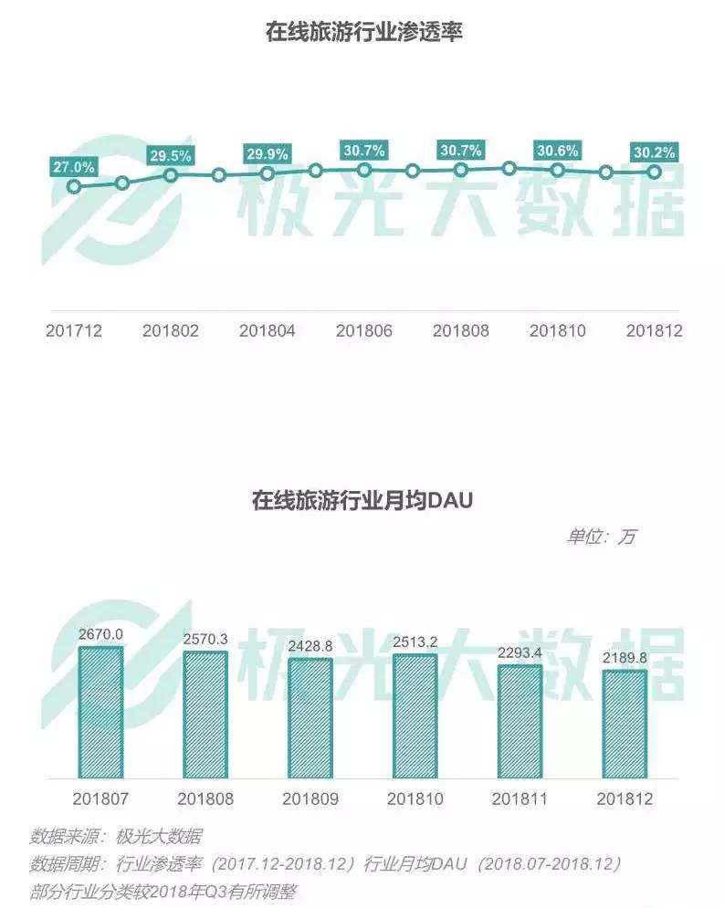 在线旅游行业2018年12月渗透率为30.2%,相比去年同期增长了10.6%。12月行业DAU均值2189.8万,与同年7月DAU均值相比有明显下降