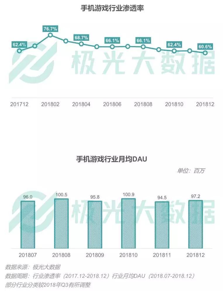 或受2018年3月版号停发的影响,从3月开始,手机游戏行业整体呈现波动下降态势。截至2018年12月,手机游戏行业渗透率为60.6%,相较2018年峰值下降21%。在过去半年里,行业DAU在1亿上下波动,12月行业DAU为9720万