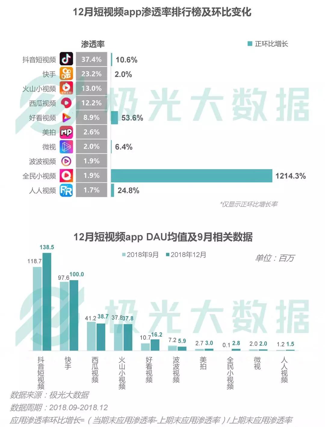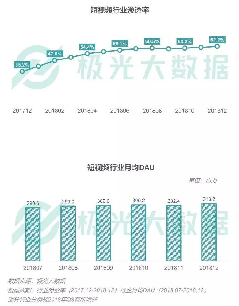 短视频行业渗透率在过去一年里呈现波动增长态势,增速于年末有所放缓。截至2018年12月,短视频行业渗透率达62.2%,同比增长76.7%,行业DAU在12月达到3.1亿