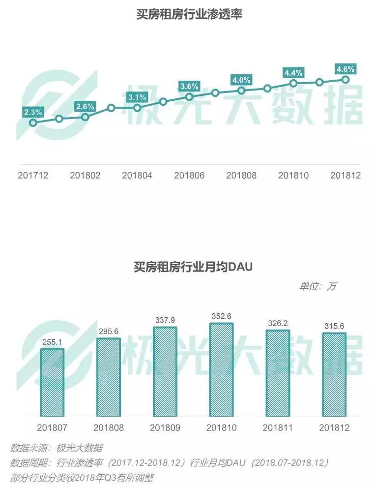 在过去一年,买房租房行业渗透率同比增长100%,12月渗透率达到4.6%。行业DAU经过10月的峰值后,12月降至315.6万