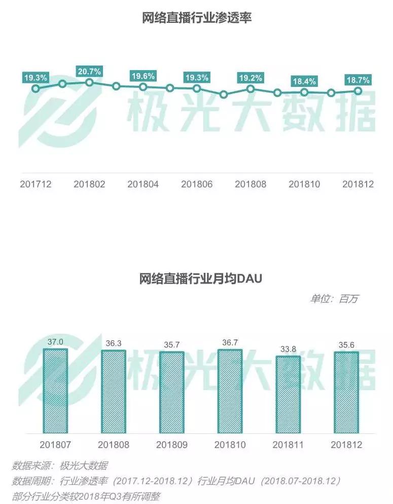 网络直播行业2018年12月的渗透率为18.7%,同比下降3.1%。行业月均DAU为3560万,相较同年7月DAU均值有一定量的下滑