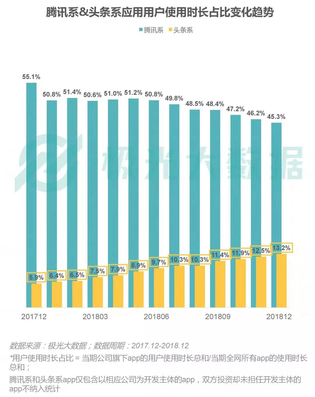 过去一年,腾讯系应用的用户使用时长在全网应用中的占比持续下降。截至2018年12月,腾讯系应用的用户使用时长占比为45.3%,较2017年同期下降9.8%。与此同时,头条系应用的用户使用时长占比在过去一年上升趋势明显