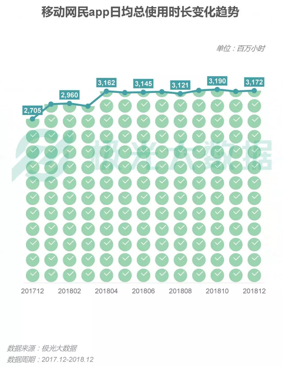 截至2018年12月,移动网民的app日均总使用时长达31.72亿小时,较17年同期增长17.3%