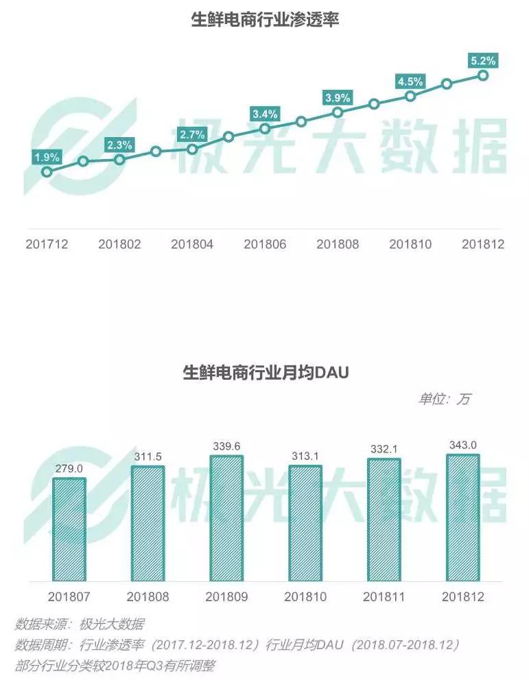 在各电商巨头的带动下,生鲜电商行业渗透率同比增长173.7%,2018年12月渗透率增长至5.2%,行业整体呈现明显的上升趋势。截至2018年12月,生鲜电商行业DAU均值达343万