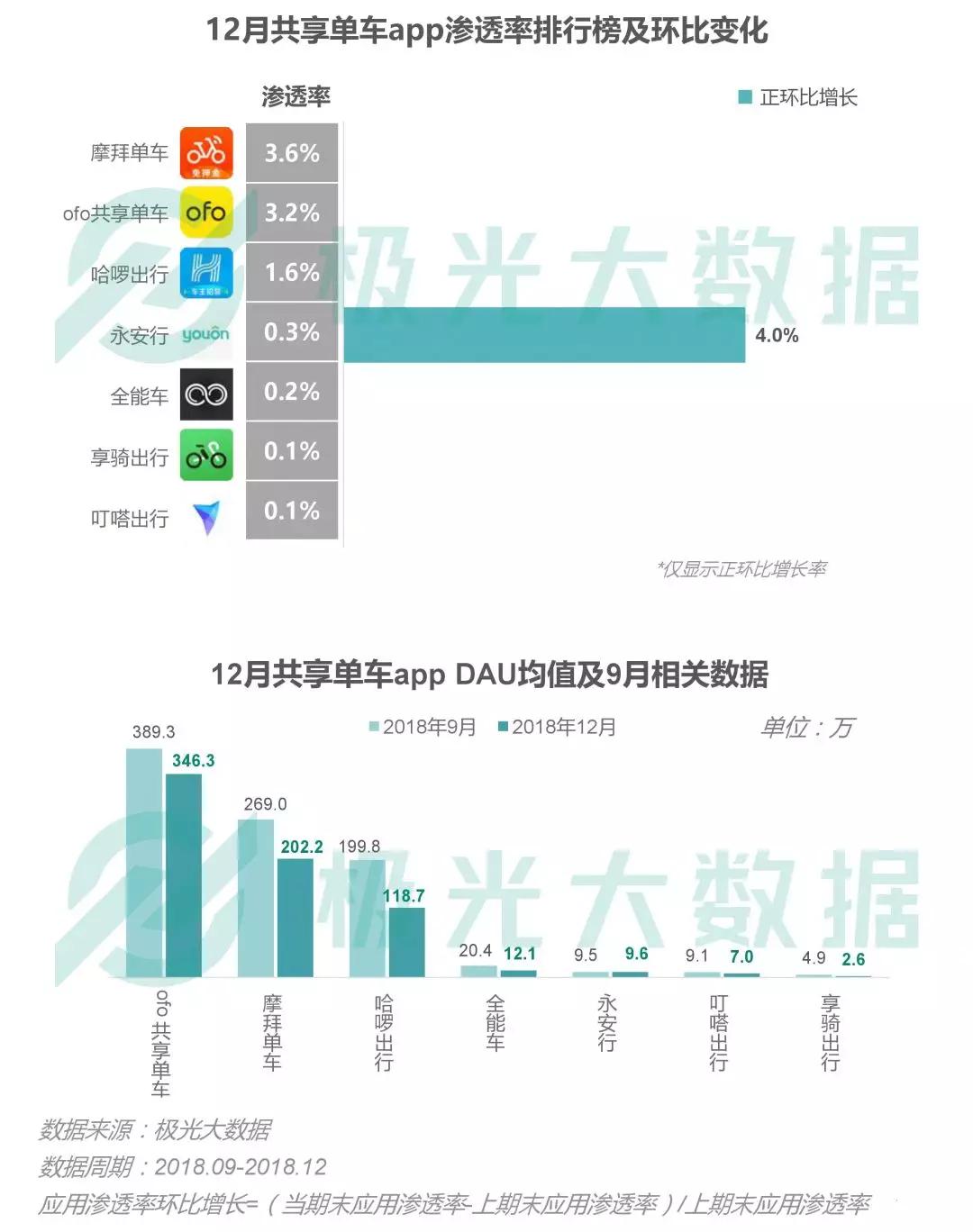 共享单车领域,排位第一的摩拜单车12月渗透率为3.6%,DAU均值下降至346.3万;ofo共享单车渗透率为3.2%,12月DAU均值降至202.2万;上榜app中唯一实现正环比增长的永安行,12月渗透率为0.3%,环比增长4%