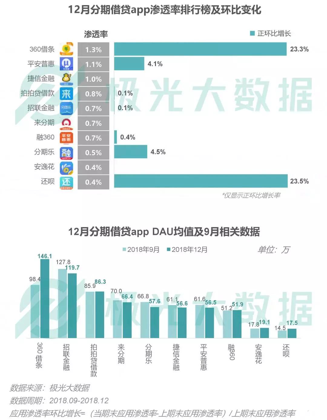 2018年12月,分期借贷行业渗透率为7.8%,同比下降21.2%;同时行业DAU增长至420.5万