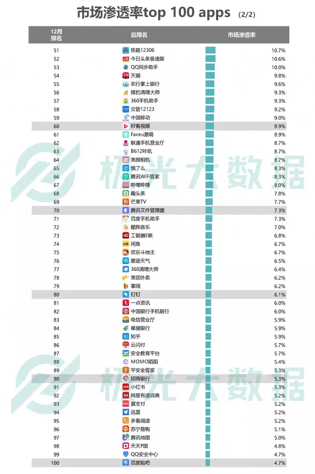 轻颜相机渗透率环比增长85.8%,12月渗透率为2.4%;快对作业12月渗透率为1.7%,环比增长82.8%;办公工具类应用腾讯文件管理器环比增长率为78.8%;云闪付12月渗透率增至5.7%,环比增长率达77.2%;百度团队旗下的好看视频环比增长53.6%,12月渗透率达8.9%