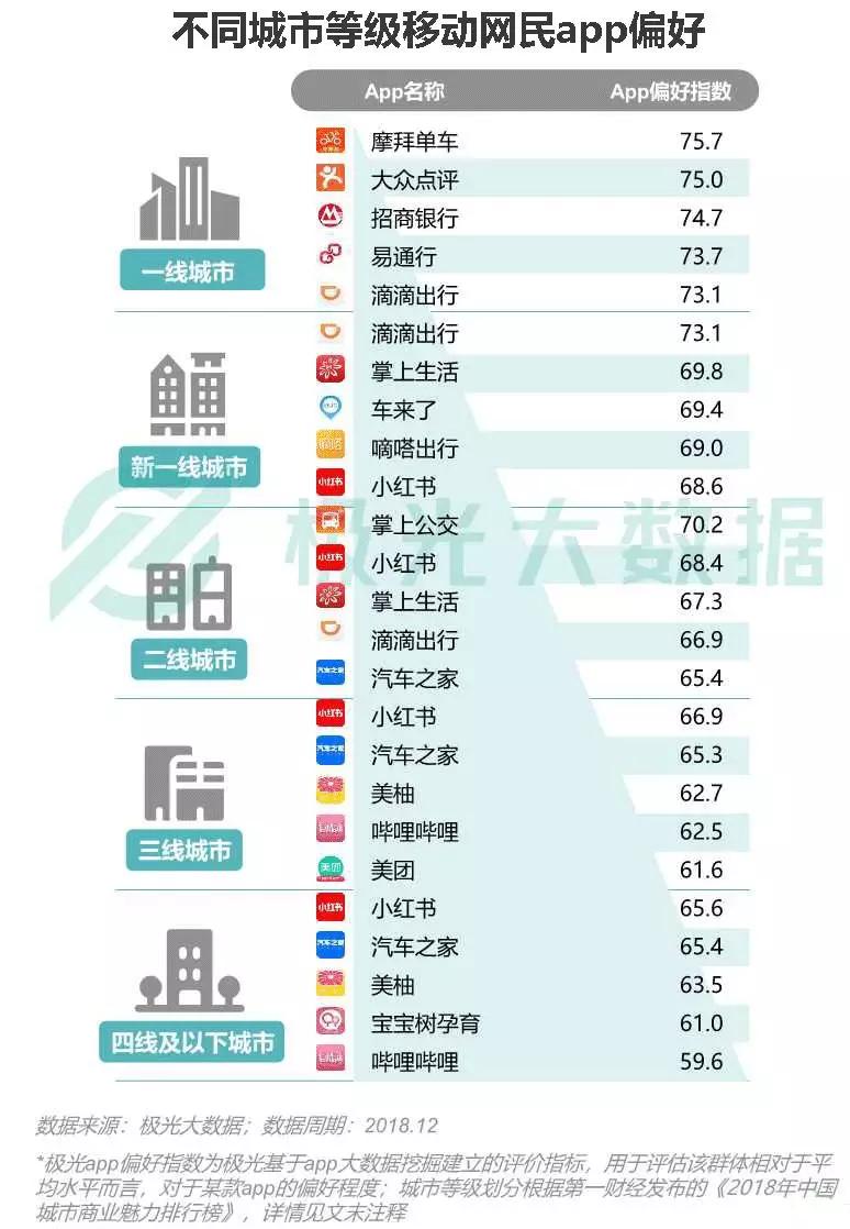 一线城市的中国移动网民最偏好的app为摩拜单车;新一线城市移动网民对滴滴出行有较高偏好度;二、三线城市和四线及以下城市的移动网民均偏好小红书及汽车之家