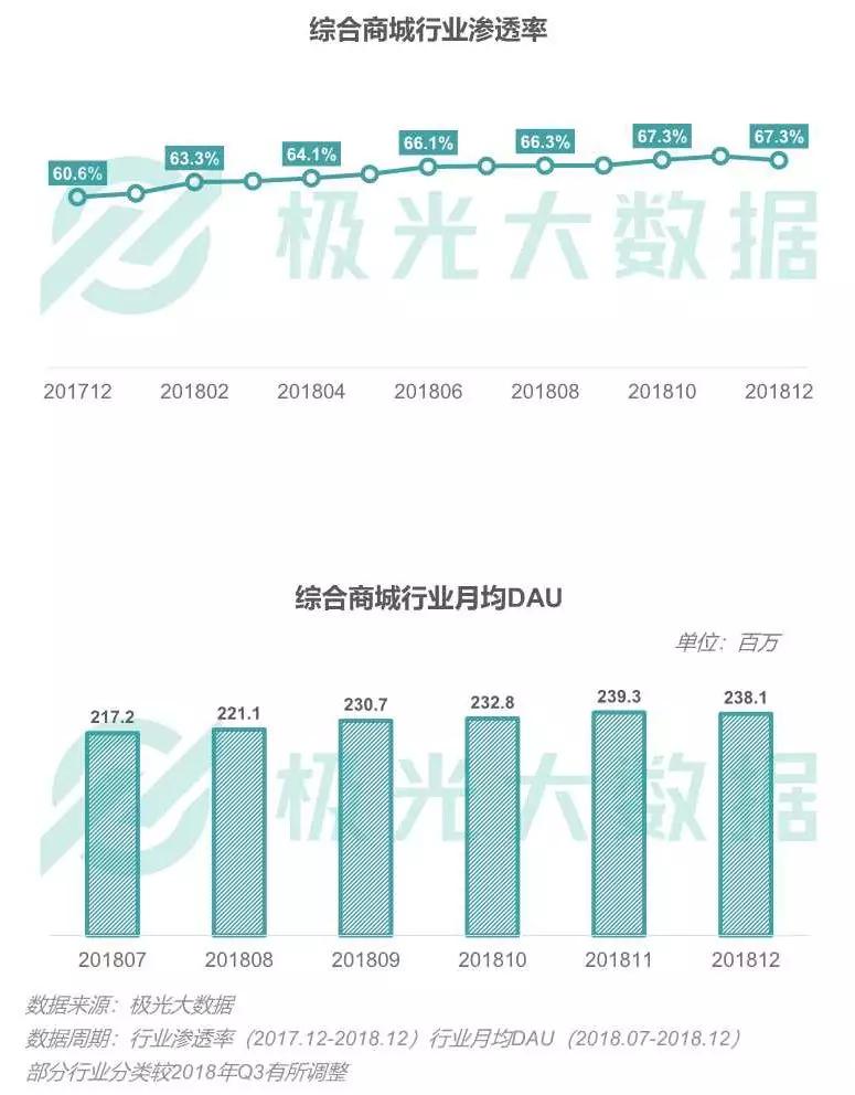 综合商城行业渗透率在过去一年里呈现波动上升态势。截至2018年12月,渗透率达67.3%,同比增长11.1%。12月行业DAU达2.4亿,较同年7月增长了2090万