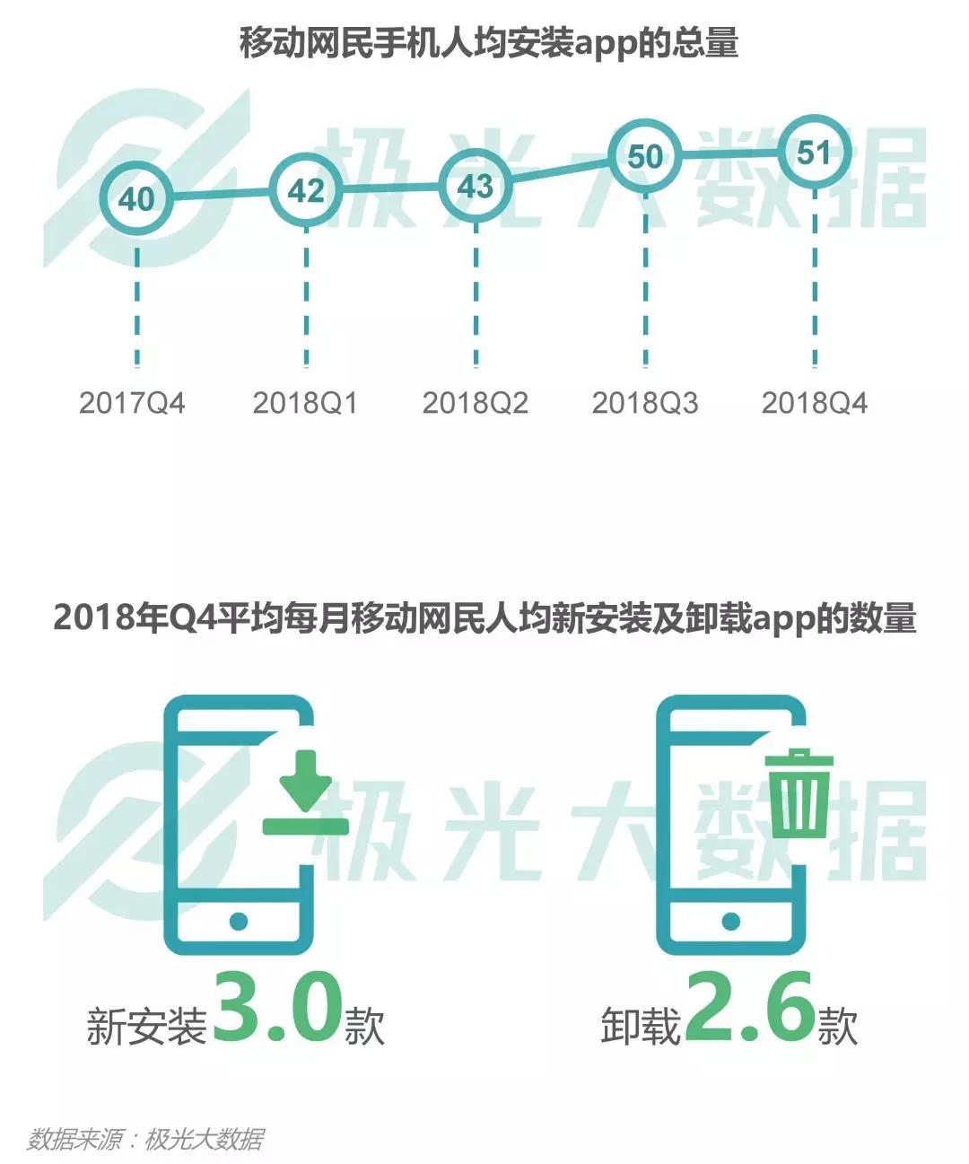 2018年Q4,平均每月中国移动网民人均新装app数量为3款,同期卸载app数量为2.6款