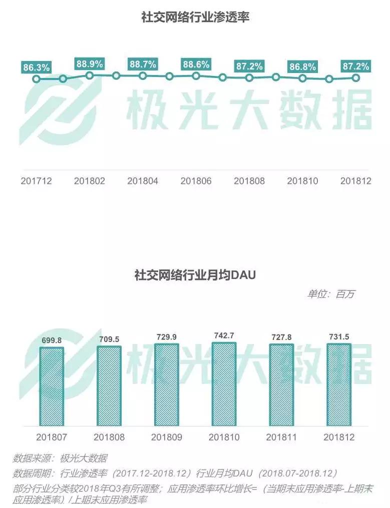 社交网络领域趋于饱和,从过去一年的社交网络行业渗透率来看,该领域发展平稳,全行业渗透率在2018年12月达到87.2%,12月行业月均DAU达7.3亿