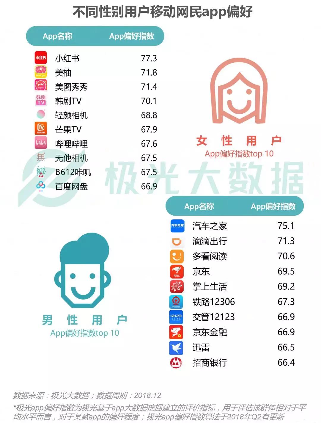 在女性移动网民app偏好指数top 10中,女性购物类app小红书的偏好指数最高,达77.3,美柚的偏好度为71.8