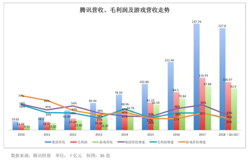 (从2010年至今,腾讯年度营收、毛利润、游戏营收走势)