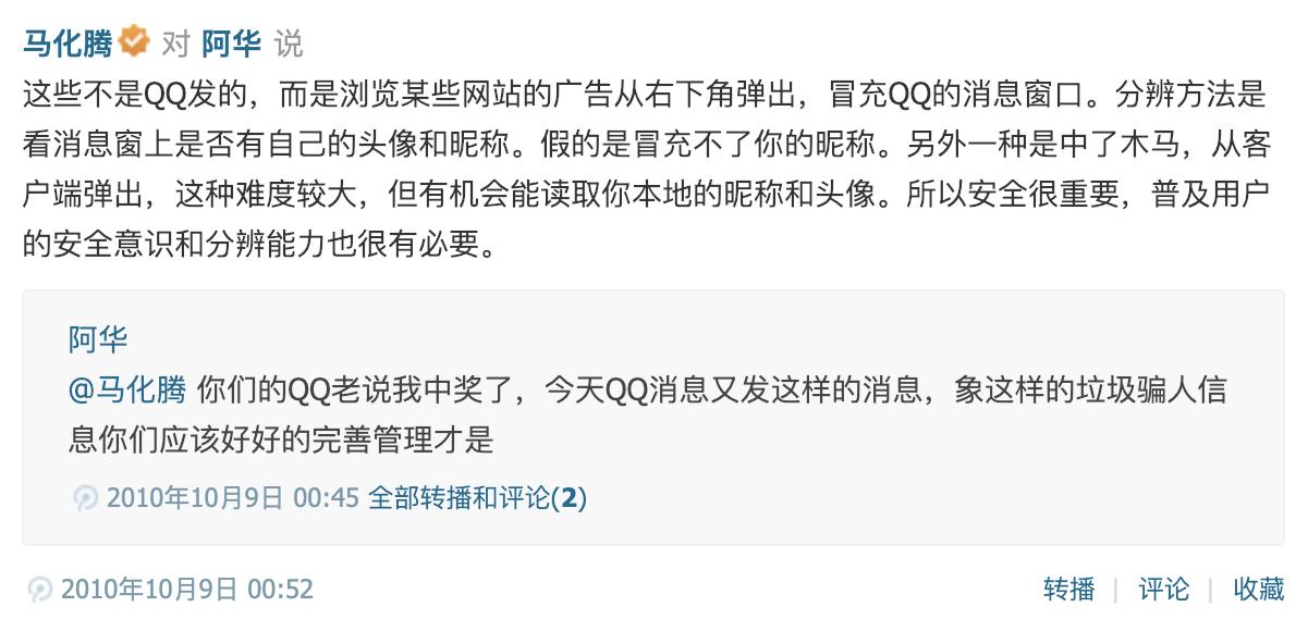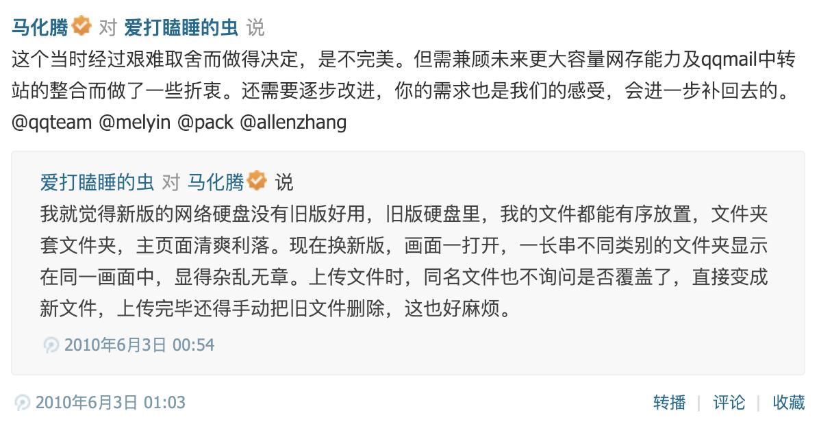 他不仅亲自体验腾讯系的产品,还频频深夜回复网友提问,抄送产品团队评估用户需求和及时修复Bug,颇为热心。以下截图均来自马化腾的腾讯微博,可以看出针对广告弹窗、网友产品疑虑等问题进行的互动: