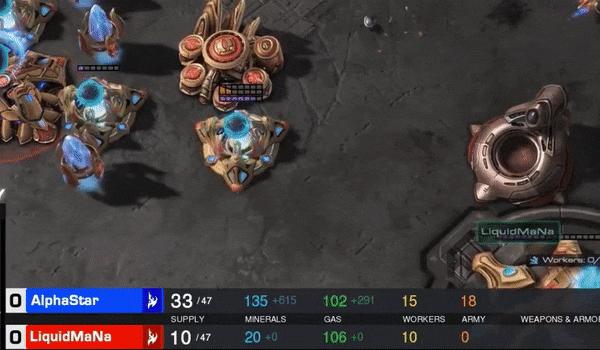 在这场比赛中,MaNa采用了一种更激进的打法,一开局就造了更多的农民(探机),这说不定是上个月刚刚跟AlphaStar学来的战术。