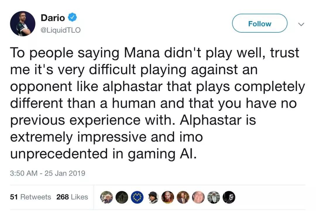 MaNa说,输了好失望,我能出的单位都出了,最后输给了一群追猎者?他还说,AlphaStar的微操太厉害了。incredible。跟AI学东西,这种经历挺好。