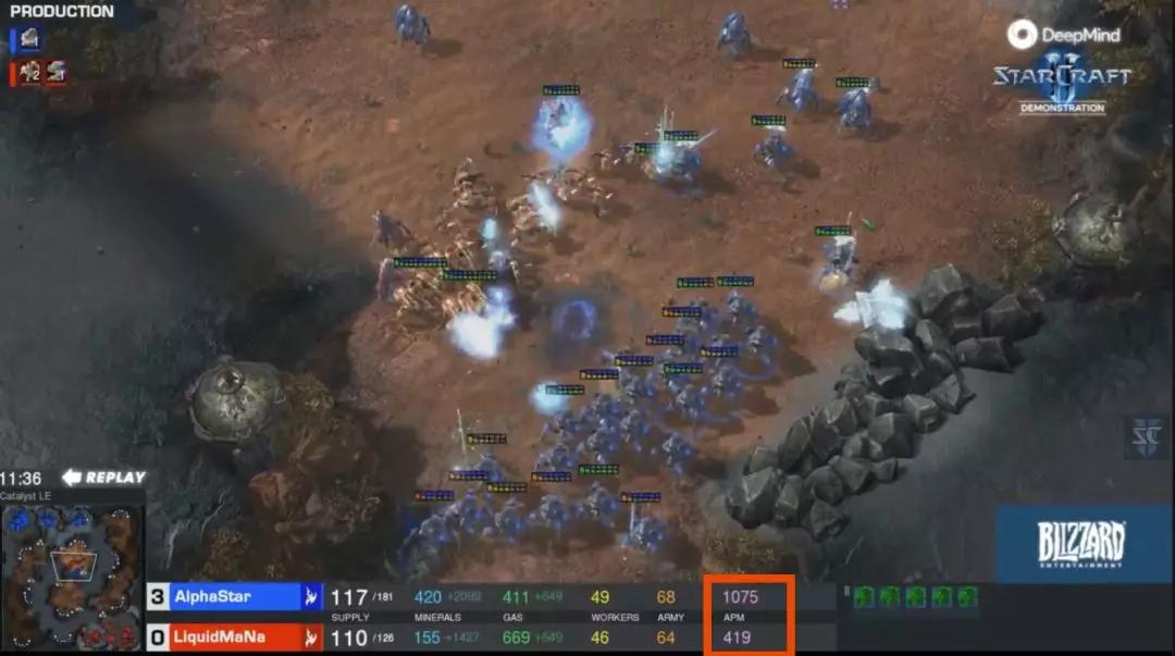 需要说明的是,其实在这局比赛中,AlphaStar的APM几乎已经失控,几度飙到1000多。量子位抓到了一些这样的瞬间。