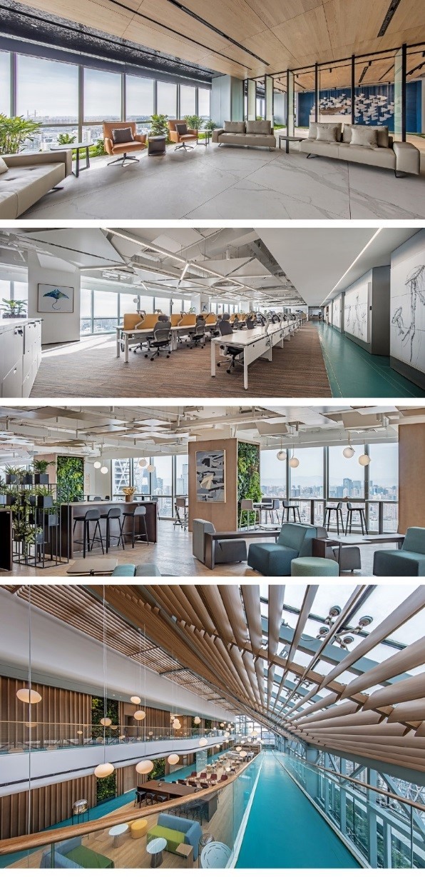 据介绍,焕新后的远洋总部不仅在传统物理空间改造上实现了新突破,在面积上设置大量的共享区域和功能房间、实现千平米内综合人均面积达8.1㎡。另外焕新办公区拥有常态工位274个,但共享的灵活工位有340-420个,即可实现小范围的虚拟工作组或会议组移动办公,并尽其所能在功能上完善用户体验感。