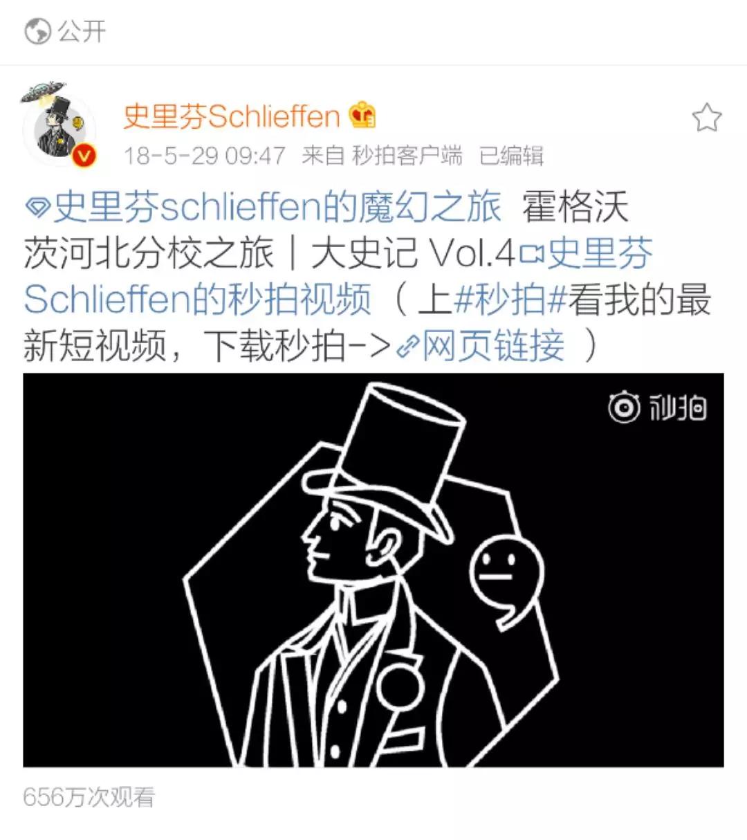 他的第一条Vlog《霍格沃茨河北分校之旅》在2018年5月底上线,作为一个当时粉丝基础为零的博主,这条Vlog获得了656万的播放量。而在此之后,史里芬的每一条Vlog都达到了百万级别的播放量。最高的一条记录保定动物园的Vlog播放量甚至达到了2000万,史里芬本人的微博粉丝量也在半年内上扬到了近百万,成为极个别“突围”头部成功的新人。过完年以后,他还会走出河北,体验全国各地的“农家乐”。