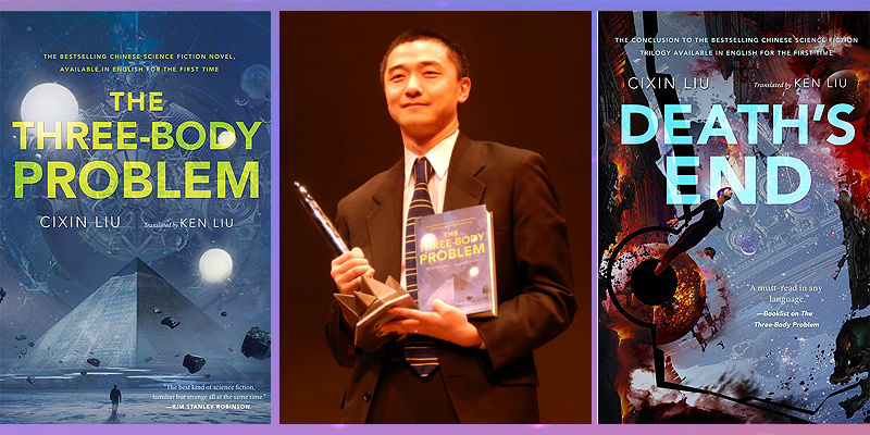 左右为刘慈欣的《三体》三部曲的第一、三册,由刘宇昆(中)翻译。图为刘宇昆代表刘慈欣收到雨果奖最佳小说。